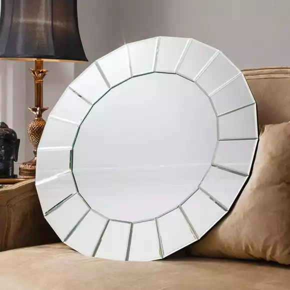 Featuring a mirrored frame with intricate detailing, this assembled mirror is fashioned with a circular design.