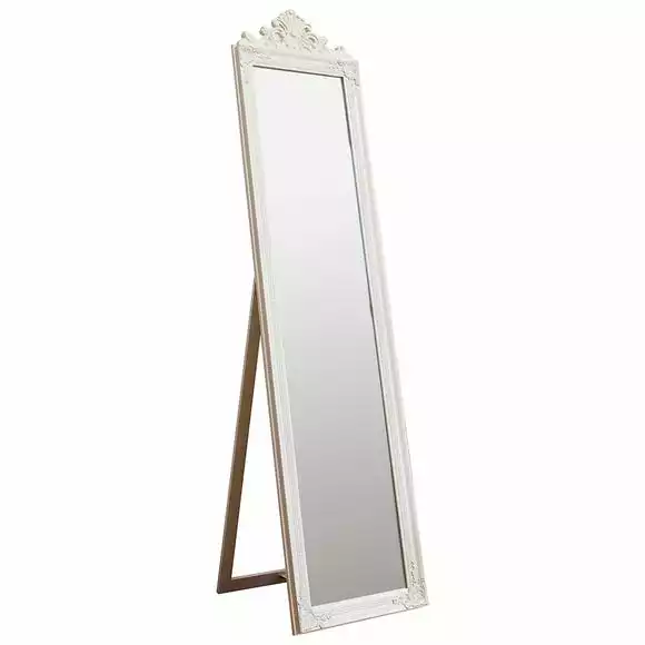 Bring a regal feel to your home with the Lalor Wood Cheval Mirror, a free standing cheval with a decorative crest and painted in a bright white finish, fit for a princess or queen.