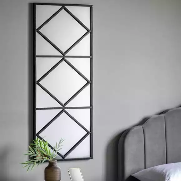 Bring the bold looks of the Severn Mirror to your home interiors with it’s large rectangle shape, geometric design on the front and bold metal frame in a clean black finish.