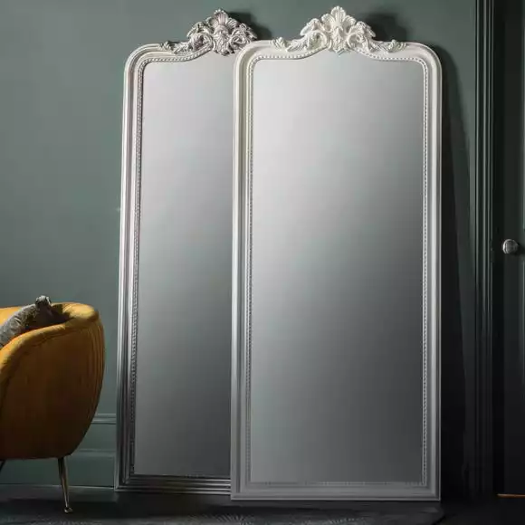 This French Chic style leaner mirror has a solid wood frame. This mirror can also be hung up on the wall and has a weight of 16kg.