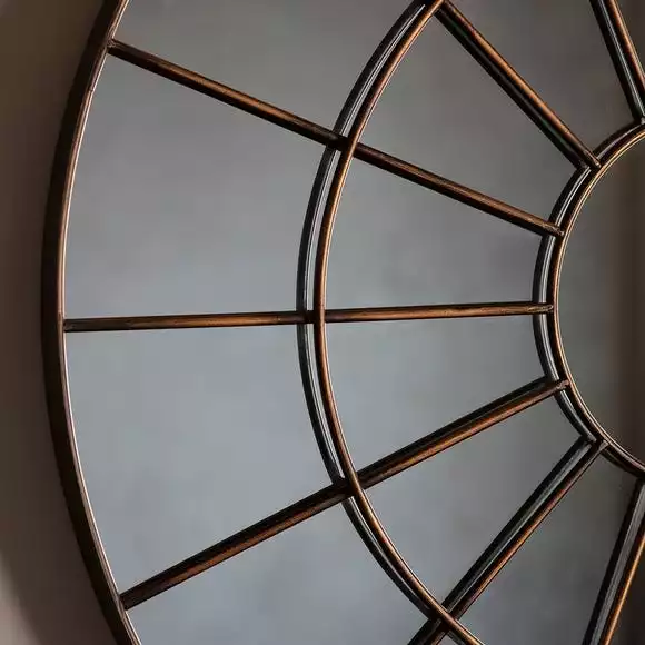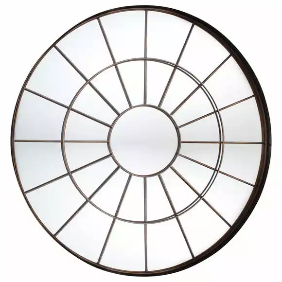 Create a statement with the Villisca Round Mirror, a large industrial window style mirror with a metal frame and bronzed effect finish.