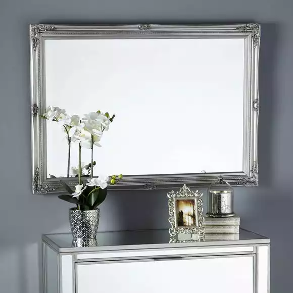 Crafted with a glossy silver finish, this ornate silver wall mirror features a highly polished resin frame with intricate detailing that adds a stylish and artistic element to your home. Whether you want to hang this stunning mirror portrait or landscape, it will be sure to inject a classic yet contemporary touch to your décor.